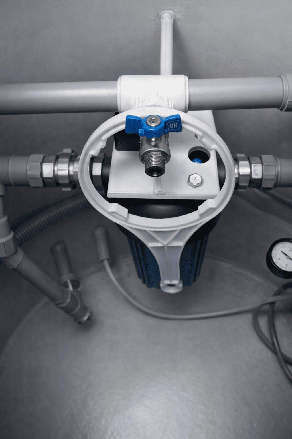 Внутрь инженерного сооружения помещают оборудование: насос для подачи воды, фильтры, компоненты автоматики, расширительный бачок.
